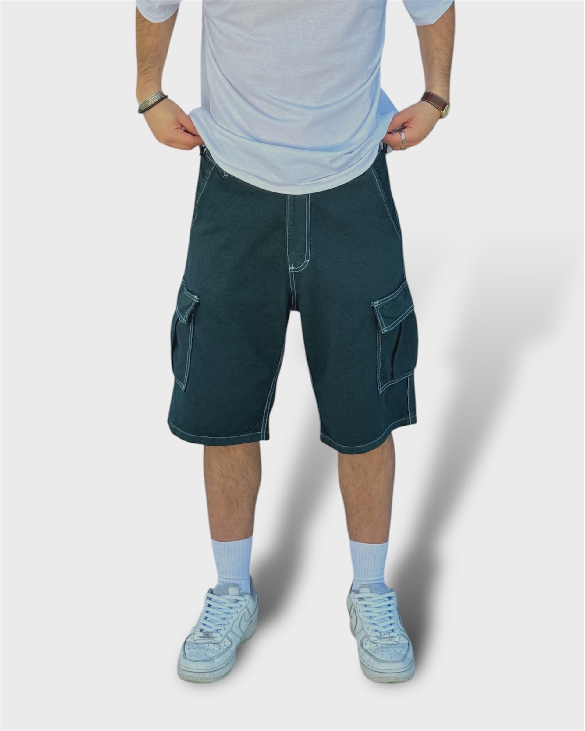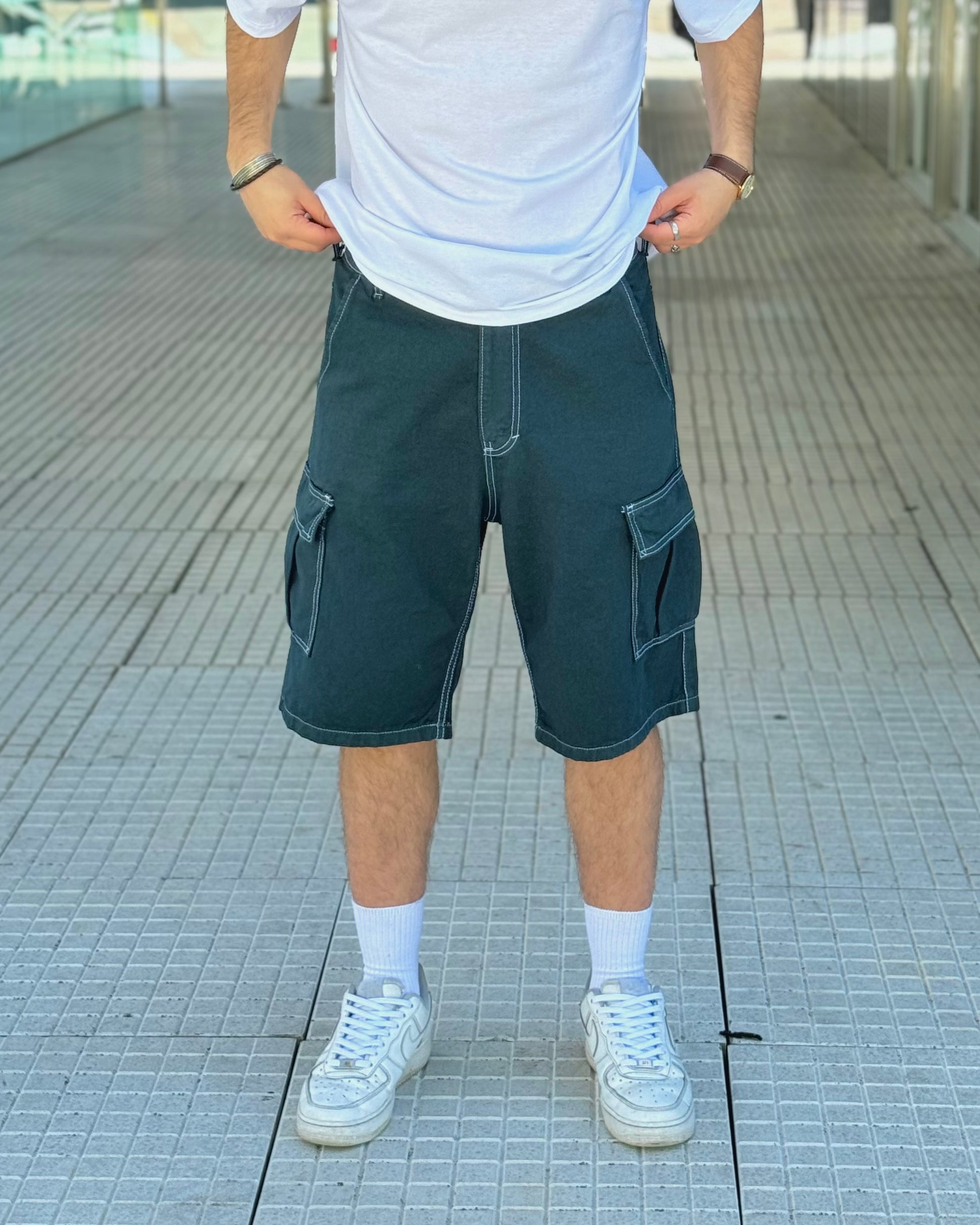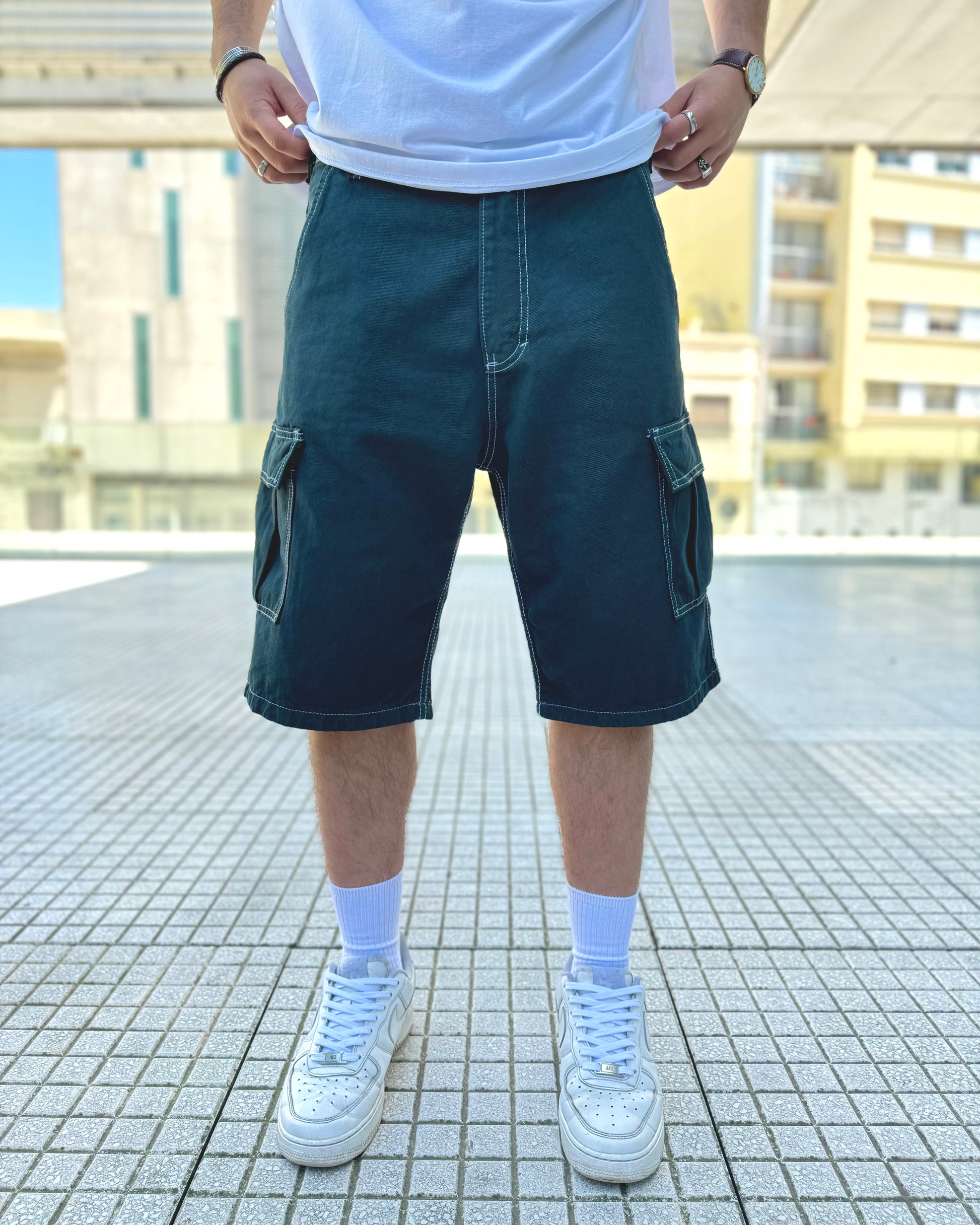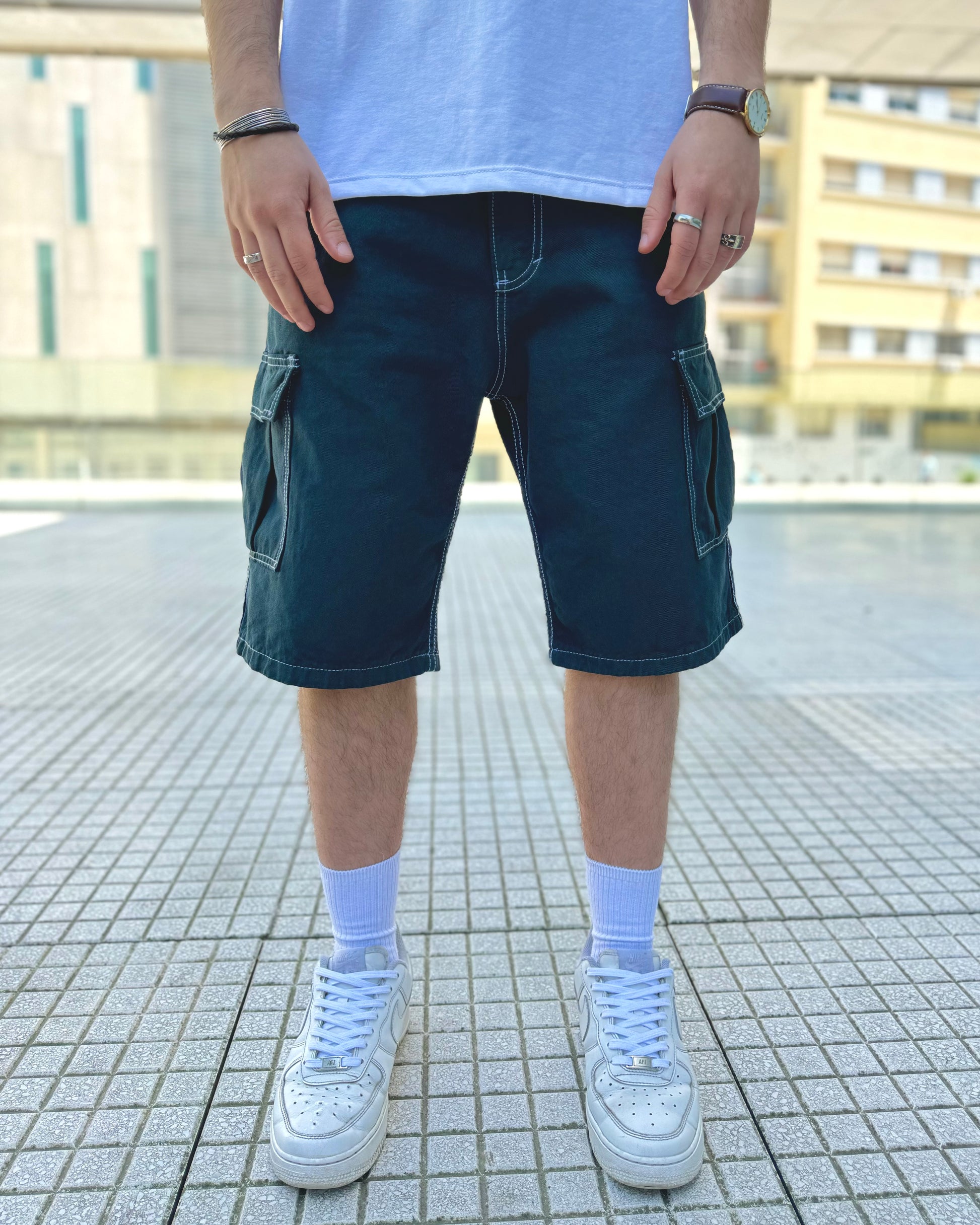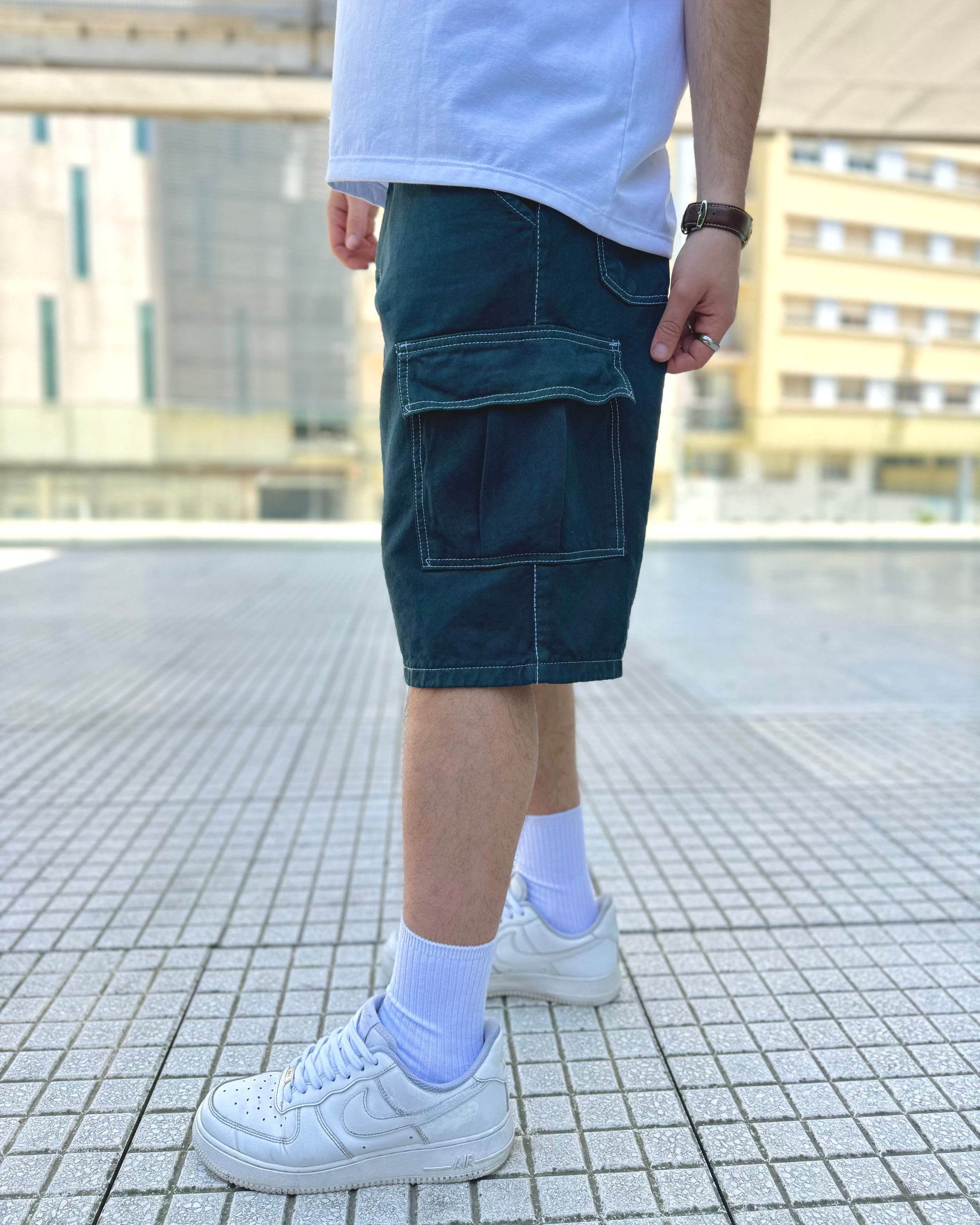Bermuda Cargo en color verde oscuro Garden con hilo blanco.